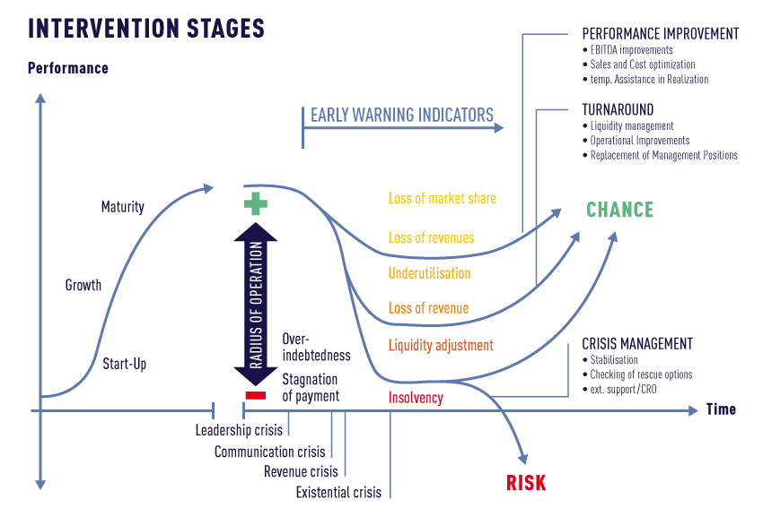 On the whole, it is true to say that the sooner you identify the early warning signs, the more options you will have available to you. Whatever phase you may be in, restructuring is not an everyday business activity and almost always requires professional support. As well as thinking of your business, you also have to consider your responsibilities towards your employees and their families, and to your own family.